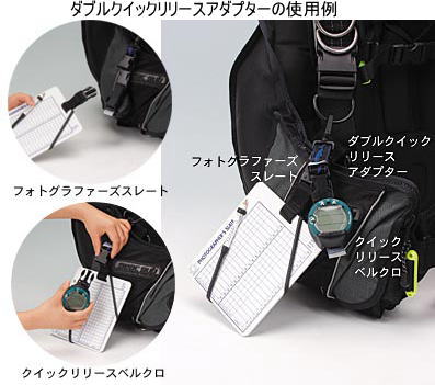 用途:コンパス、ダイブコンピュータ、ダイバーズウォッチ等々。付属のベルクロマジックベルト(幅:19mm)で、コンパス等の取り付けができ、メス・コネクターが装備されている物と接続が可能です。