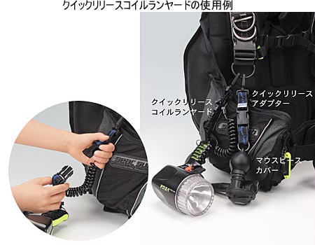 用途:ゲージ、水中ライト、カメラ等々。クイックバックルを外せば、約90cmまで伸びます。ライト等の落下を防止します。