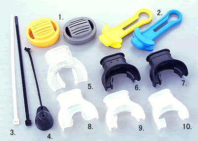 マウスピース、BC用ジャバラホースなどの取り付けに使用。その他いろいろな固定にも使用。 |