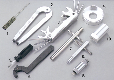 6サイズのスパナ、ドライバー、棒レンチなど、12種類の工具がセット。 |
