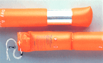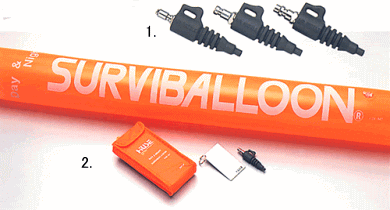 ・大型のシグナルフロート「ライトバルーン」と、それを膨らませるためのエアーノズル、そして太陽光を反射させるステンレスミラーの3点セットです。ライトバルーンは大型で、遠方からの認知性に優れており、夜間にはライトバルーン底部に水中ライトをいれることで、バルーン本体を照し出すことができます。また上部には反射シールとルミカライト取り付けることができるポケットがあります。
